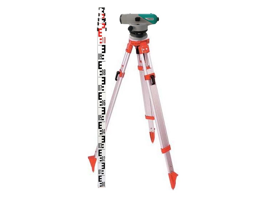 (přední strana stupnice má centimetrové dělení 0–5m ( tak zvané E ), zadní strana latě má milimetrovou stupnici 0–5m. Ve složeném stavu měří 1,235m).